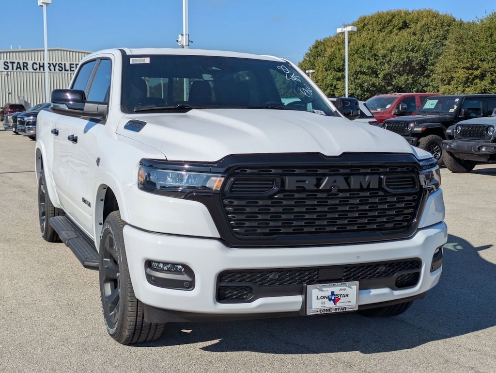 QUICK ORDER PACKAGE 27R LONE STAR -inc: Engine: 5.7L V8 HEMI MDS VVT eTorque, Transmission: 8-Speed Automatic (8HP75), Lone Star Badge , REAR WHEELHOUSE LINERS, RADIO: UCONNECT 5 NAV W/12.0" DISPLAY, NIGHT EDITION -inc: Tires: 275/55R20 OWL All Season, Bridgestone Brand Tires, Accent Color Premium Power Mirrors, Exterior Mirrors w/Supplemental Signals, Black Headlamp Bezels, Exterior Mirrors Courtesy Lamps, Grille Black Surround Black Mesh, Auto Power-Folding Mirrors, Wheels: 20" x 9.0" Aluminum Painted Clad, Auto Dim Exterior Driver Mirror, Black Exterior Truck Badging, Anti-Spin Differential Rear Axle, Accent Color Door Handles, Accent Color Tailgate Handle, Black Interior Accents, Dual Exhaust w/Black Tips, Body Color Front Bumper, Body Color Rear Bumper w/Step Pads, Black Tail Lamp Bezels, RAM Grille Badge - Black, Black Painted Exterior Mirrors Caps, MOPAR FRONT & REAR RUBBER FLOOR MATS, MOPAR BLACK TUBULAR SIDE STEPS, GVWR: 7,100 LBS, FRONT LICENSE PLATE BRACKET, BRIGHT WHITE CLEARCOAT, BLACK, DELUXE CLOTH BUCKET SEATS -inc: Power Adjust 8-Way Driver Seat, Rear 60/40 Folding Seat, Rear Center Armrest, Front Seat Back Map Pockets, Power 2-Way Driver Lumbar Adjust.